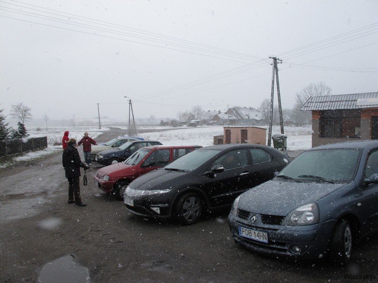 Deszcz w nocy a rano śnieg zaskoczył nas  ale nie przestraszył  i w (prawie) pełnym składzie stawiliśmy się na umówionym miejscu w Łukowie przy  drewnianym kościółku.